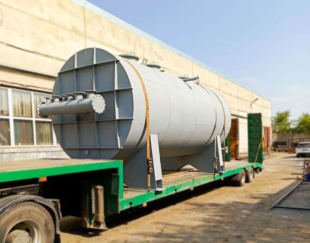 Горизонтальный резервуар представляет собой цилиндрическую емкость с опорными седловыми ложементами. Такое решение обеспечивает равномерное распределение нагрузки и устойчивость при заполнении.